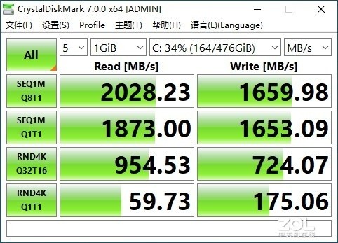 硬盘测试,使用CrystalDiskMark7.0.0对固态硬盘进行测试,最终得到以下成绩:在队列数为8、线程为1时,持续读取为2028MB/s、持续写入为1659MB/s;在队列数为1、线程为1时,4K随机读取为59.73MB/s、4K随机写入为175.06MB/s。从测试结果来看,这块固态硬盘的性能处于PCIE SSD的中等水平。