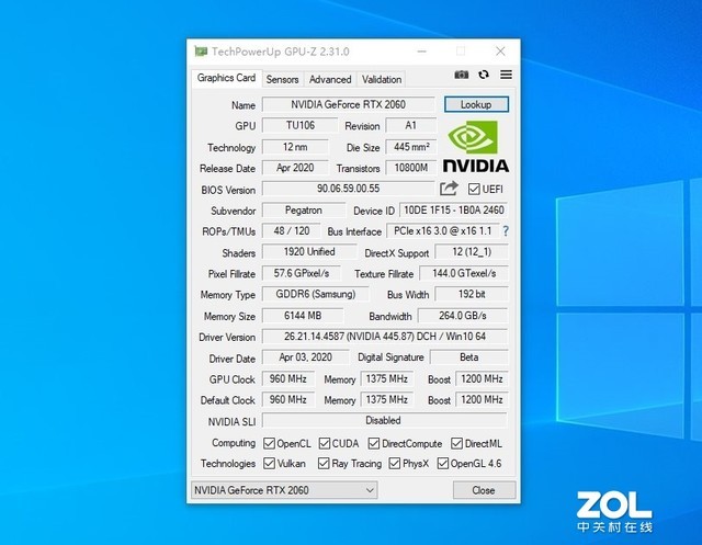NVIDIA GeForce RTX 2060基于图灵架构,拥有1920个CUDA、6GB GDDR6显存、显存位宽192bit,基础频率960MHz、Boost频率1200MHz,显存频率为1375MHz。