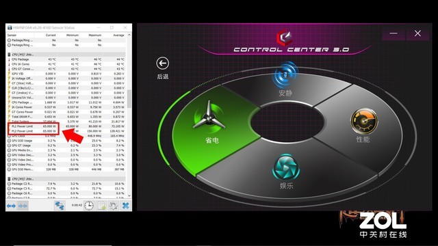 我们通过HWiNFO来查看处理器的PL1、PL2功耗,神舟战神TX9-CU5DK在Control Center中预设了安静、省电、娱乐、性能四种电源模式,每种模式下的PL、PL2功耗如下所示: