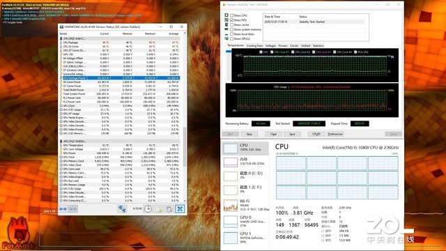 我们通过双烤测试(AIDA64 FPU+FurMark 0X MSAA)来检验笔记本的散热能力,30分钟后,处理器频率为3.81GHz,温度为98℃,功耗为65W,显卡频率为1035MHz,温度为91℃,功耗约为109W。处理器功耗全程不低于65W,显卡功耗略低于115W,此时键盘区域在体感温度上比较烫手。