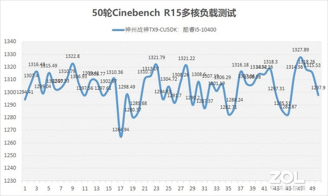接下来我们对处理器进行更为严苛的50轮Cinebench R15多核负载测试以检测处理器的持续负载能力。如前所述,一般在这个项目中,移动标压/低压处理器因为限制了处理器的PL1、PL2功耗,以至于处理器的性能在长时间负载之后明显下降,神舟战神TX9-CU5DK在性能模式下完全解锁了对处理器的功耗限制,因此理论上会有比较好的性能释放。