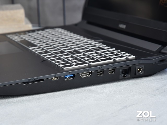 笔记本在接口上的配置也非常强大,机身左右两侧一共有2个USB 3.2接口,1个USB 2.0接口、一个Type-C接口、三个视频输出接口(1×HDMI、2×Mini DP),还包括一个SD卡插槽、一个RJ-45网口以及两个3.5mm音频接口。