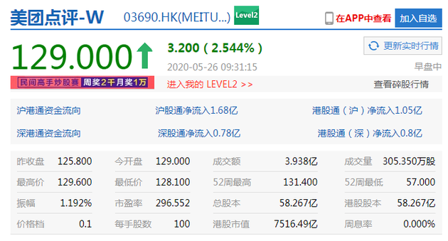 5月26日上午消息,美团点评周二开涨2.54%,报129.00港元,港股市值7516.49亿港元。昨日美团点评公布2020年第一季度财报,财报显示美团点评第一季度营收和净利润高于市场预期。