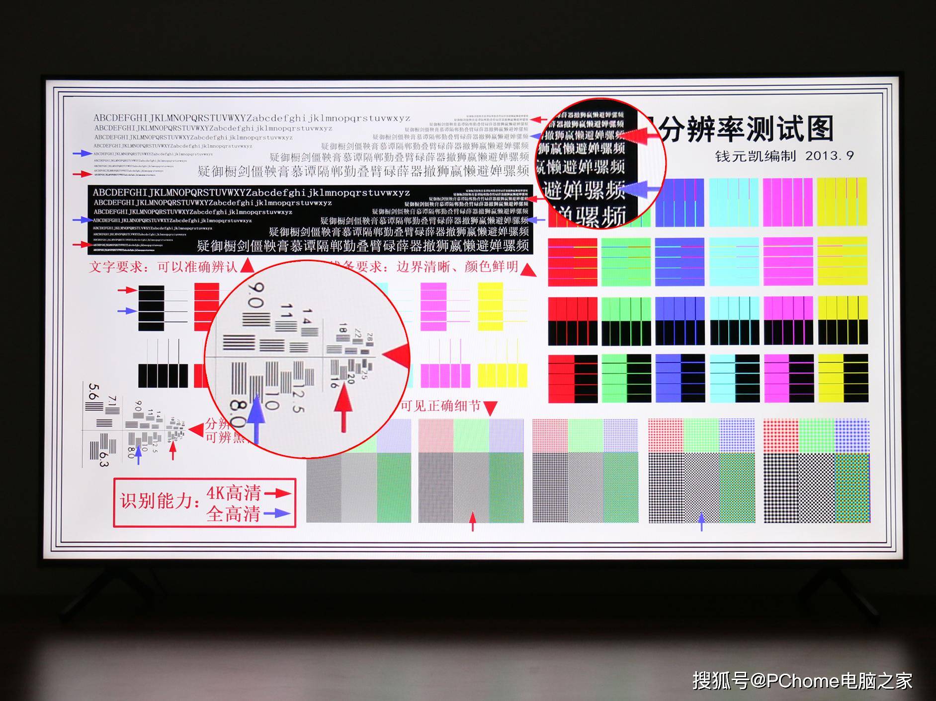 字体显示还原部分,蓝色箭头所指为1080p分辨率、红色箭头则为4K分辨率。通过实际的拍摄可以看到在所展示的8行文字内容中,荣耀智慧屏基本都可以很好的将字体还原出来,只是在最小号的字体还原上有些许模糊,不过也已经达到了4K分辨率的及格标杆,相比于很多标称4K分辨率的产品来说已经是一个很不错的表现了。