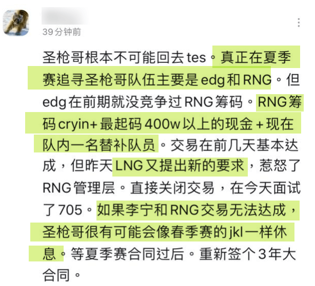 在转会期前一天,虎扑上就有网友爆料圣枪哥连接RNG失败,最主要的就是LNG交易前加价,本来RNG准备了Cryin、400W现金、一名替补选手,结果LNG仍不满意,于是双方直接关闭了交易,同时圣枪哥也取关了LNG官博,根据这名网友所说,LNG可能会冷藏圣枪哥,就跟之前JKL一样整个赛季不能上场。