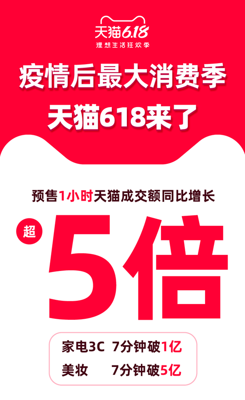 5月25日上午,阿里巴巴便公布了预售数据:预售两小时内,兰蔻、欧莱雅、后等品牌成交额突破1亿。天猫消费电子、家装等行业率先实现7分钟破1亿,美妆7分钟成交额超过5亿。