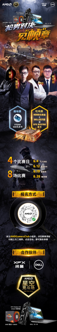 枪男对决见“帧”章,AMD星空竞斗场激战不熄,吃鸡专场燃力启程!即日起,AMD星空竞斗场吃鸡专场主播水友挑战赛参赛队伍招募正式启动。本周,AMD将携手斗鱼人气主播气人主播QQQ一起见证水友赛冠军的诞生,更有戴尔、讯景等战略合作伙伴合力提供最IN最潮的硬件支持,为一切草根高手搭建梦想的舞台。如果你是民间大神,希望靠手中钢枪打出一片天地,那就赶快叫上伙伴们一起来AMD星空竞斗场,与兄弟一同并肩作战,与队友共同踏上通往最高荣誉的道路。