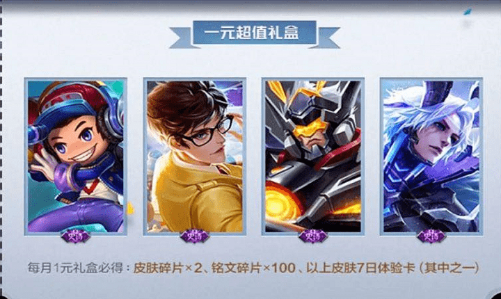 喜欢的玩家真的可以出手了,其次就是同样在本次的更新中的福利了,一个每月一次的限时秒杀7日体验卡的机会,本次的1元秒杀也是加入了四款皮肤,分别是特工魅影,电玩小子,黄金分割率,吕布末日机甲皮肤,其中守约特工魅影的人气以及颜值无疑都是最高的,即便是7日体验卡依然值得考虑。