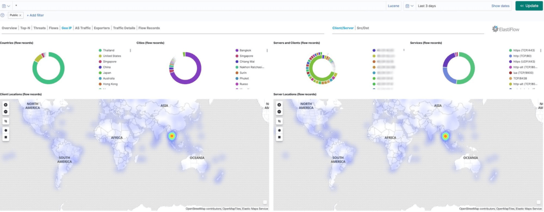 AWN使用了一个名为ElastiFlow的工具,该工具简化了将NetFlow或sFlow数据获取到Elasticsearch中的过程,在那里可以使用Kibana快速可视化。预建的“地理IP”仪表板总结了被捕获流量的地理分布情况,不出所料,大部分的流量来自泰国,尽管也有相当数量的流量来自周边国家。