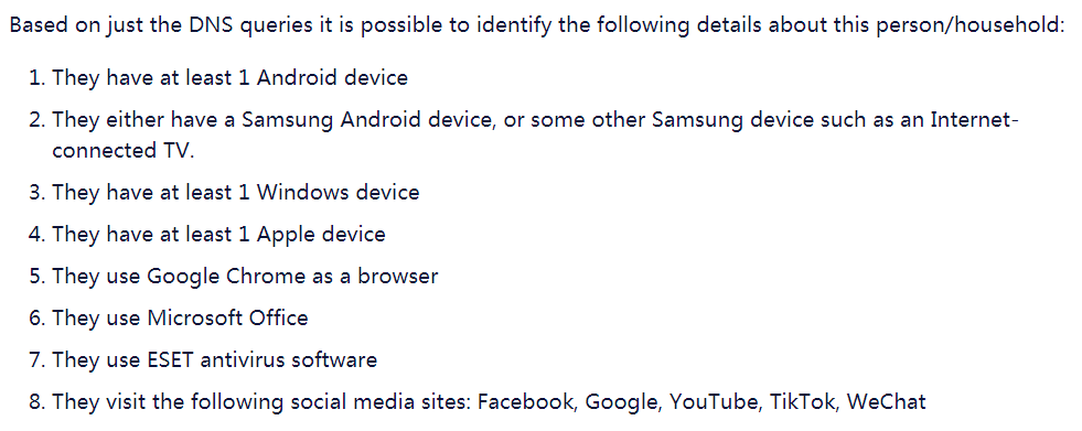 DNS查询数据还可以用于深入了解一个人的互联网活动。Paine利用数据展示了任何人都有权访问数据库,并从中获取某些信息,比如用户拥有的设备、他们运行的病毒软件、使用的浏览器以及社交网络、经常打开的媒体应用和网站。考虑到在家庭或办公室中,许多人共享同一个网络连接,这也使得利用网络活动追溯到特定个人变得更加困难。