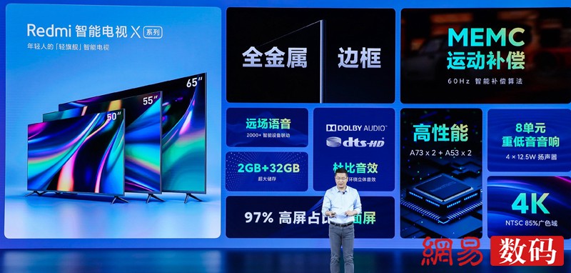 网易数码讯,5月26日消息,小米旗下专注极致性价比体验的Redmi品牌于今日下午举行线上新品发布会,会上除了主角--售价1599元起的Redmi 10X系列双模5G手机之外,智能电视机品类也带来了全新的的X系列新品(包含65英寸的X65、55英寸的X55和50英寸的X50三款),其中65英寸的X65首销价仅为2999元。