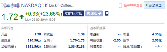 北京时间5月26日晚间消息,瑞幸咖啡开盘涨22.30%,报1.70美元。当前市值为4.35亿美元。