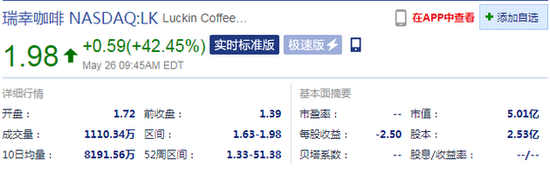 北京时间5月26日晚间消息,截止北京时间21.47,瑞幸咖啡涨幅扩至42.45%,报1.98美元,当前市值为5.01亿美元。
