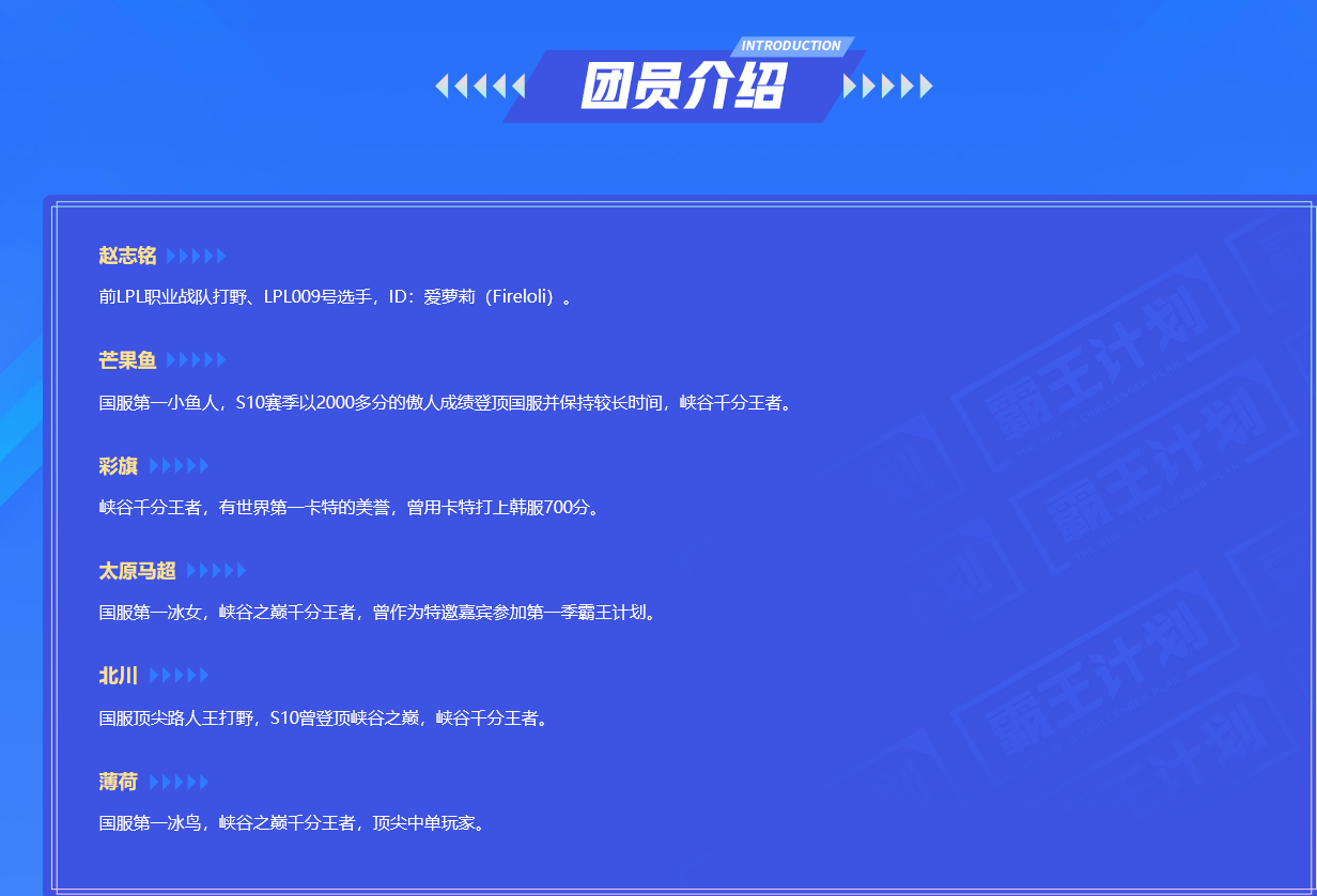 霸哥作为虎牙弹幕文化的“一部分”,在英雄联盟峡谷中“抗压”一直都是颇有心得。左手石头人,右手狗熊,即使在面对IG入驻时候的Theshy,也用自己的狗熊单杀了对面Theshy的滑板鞋。如今,虎牙为了再次推出“霸王计划2.0”活动,在去年这样的活动也推出过,当时也是有虎牙的几个技术主播来和霸哥双排。在这一期的“霸王计划2.0”中,虎牙派出了6名队员,分别为:“芒果鱼、赵志铭、北川、彩旗、太原马超、薄荷。”