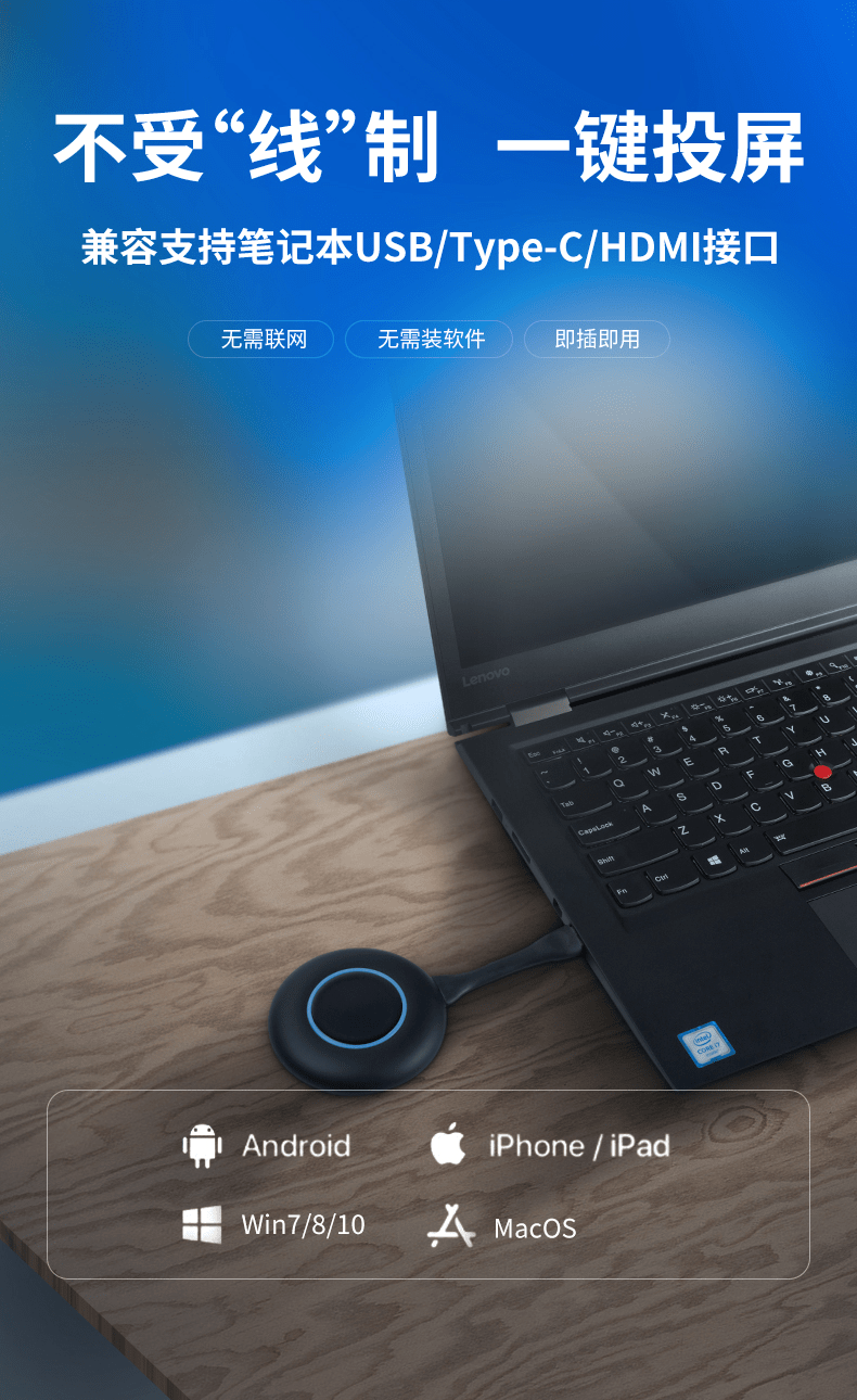 上面的实操视频中,大家可以看到,笔记本电脑在会议室无线投屏的过程中,笔记本电脑与电视之间并没有连接信号线,而是在笔记本的USB接口插入了一支圆形状的按键,我们叫“USB投屏按键:使用起来非常简单,不需要做任何设置,不需要安装任何软件,也不需要连网,只需简单三步即可完成无线投屏展示。