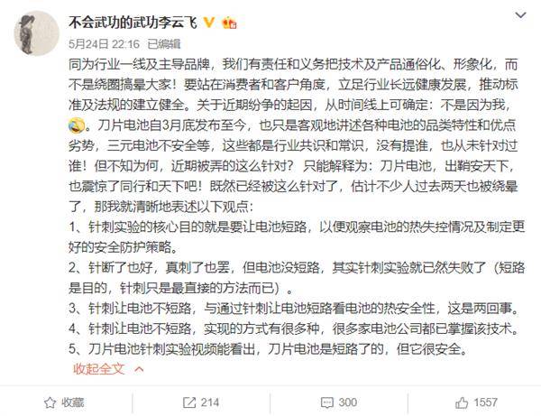 5月24日,比亚迪汽车销售公司副总经理李云飞在微博继续回应称,针刺实验的核心目的就是要让电池短路,以便观察电池的热失控情况及制定更好的安全防护策略。但电池没短路,其实针刺实验就已然失败了。针刺让电池不短路,实现的方式有很多种,很多家电池公司都已掌握该技术。刀片电池针刺实验视频能看出,刀片电池是短路了的,但它很安全。