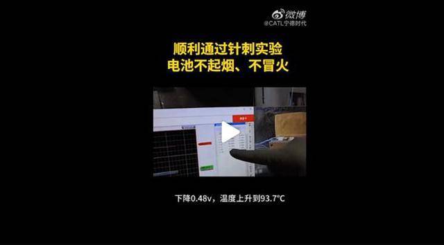 在网友的质疑下,5月23日,宁德时代又发布了一则新视频,对宁德时代5系三元电芯、某款8系三元电池均做了针刺测试,测试结果良好,未出现明火和高温。