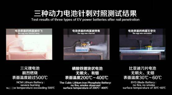 在现场播放的“针刺穿透测试”视频中,三元锂电池在针刺瞬间出现剧烈的温度变化,表面温度迅速超过500℃并开始剧烈燃烧,电池表面的鸡蛋被炸飞;传统磷酸铁锂块状电池无明火、有烟,表面温度达到200℃~400℃;“刀片电池”在穿透后无明火、无烟,电池表面温度仅有30℃-60℃左右。