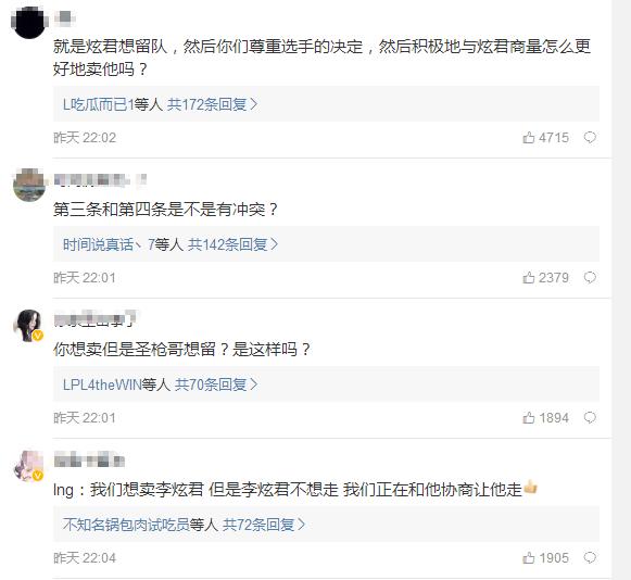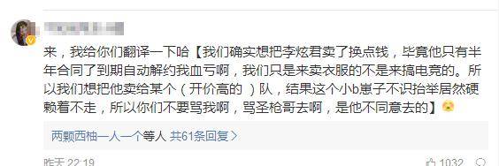 网友表示:来,我给你们解释一下哈:我们确实想把李炫君卖了还点钱,毕竟他只有半年的合同了到期自动解约我血块 ,我们只是来卖衣服不是来搞电竞的,所以我们想把他卖给某个开高价的队伍,结果这人不识抬举硬赖着不走,所以你们不要骂我啊骂圣枪哥去啊,是他不同意取得。(这条评论下面一片叫好,可见这个评论是多么的精髓)