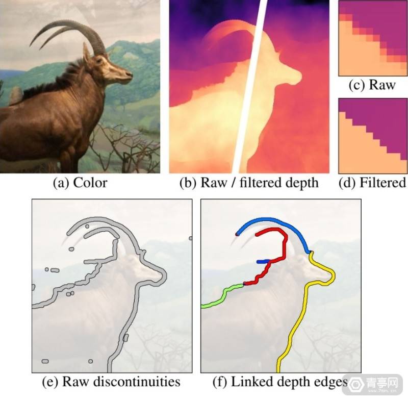 图像预处理过程:a-b,颜色和深度输入;c-d,使用双边滤波锐化;e,基于视差值检测不连续性;f,消除虚假差值,优化图像边缘深度