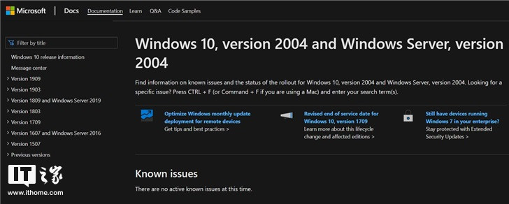 IT之家发现,标题为“ Windows 10版本2004和Windows Server版本2004”的页面当前为空,但在另一页面中,微软表示2020年5月更新没有任何活动的已知问题。