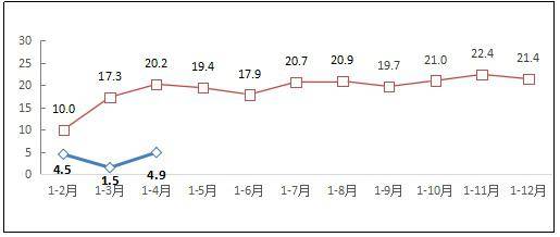 行业利润扭转下滑局面。1-4月,全行业共实现营业利润327.3亿元,同比增长4.8%,扭转1-3月下滑(-24.9%)局面,仍低于去年同期29.1个百分点。