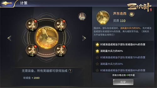 “声东击西”的意思是声张击东而实击西。此计用以迷惑敌人,造成敌人错觉,给敌人出其不意的攻击。在《三十六计》手游中,如果使用此计策,攻击城池时,先消耗最大兵力的50%攻打城池(造成部队攻城值50%的伤害),再与城防军作战。先攻城再杀敌,使得平民玩家在国战中的战斗力大增!