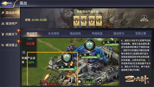 在国战中,所有在同一个城门(内城)上的防守玩家按照先来后到的顺序排成一个队列;敌军进攻时,从队首玩家开始与敌军交战;如果完成交战的防守方主将血量耗尽或部队士气耗尽,就返回最近的内城,队首的防守均继续作战;如果完成交战的防守方主将血量仍有剩余或部队士气仍有剩余,就排至队列末端,队首的防守军继续作战。这样就可以让每个人都有参与战斗的机会,一起为了攻城守城而战斗!