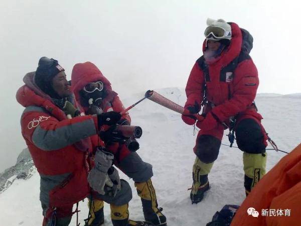 登山队员登到峰顶以后,大概会待一个小时左右,对于登顶队员,这已经是极限了。主要就是(考虑到)大家带的氧气,此外峰顶的风也非常大,气温也比较低,不能待太长时间。登山队员主要在上面把觇标立起来;还要用卫星定位接收机测量峰顶的位置和高程;第三,还要用雪深雷达把山顶雪深测量一下。