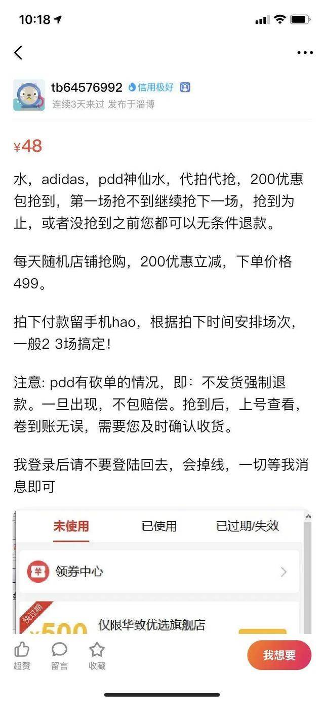 在前不久拼多多美妆百亿补贴的活动中,由于场面一度火爆。甚至在闲鱼等平台内出现了代抢神仙水/商品券的业务。