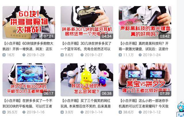 甚至有段时间,拼夕夕的选题成为了各大数码及各大开箱博主的最爱,各种百元拼多多购物系列的视频层出不穷,一个博主靠着专门制作拼多多数码“防坑指南”积累起来了数十万的粉丝。