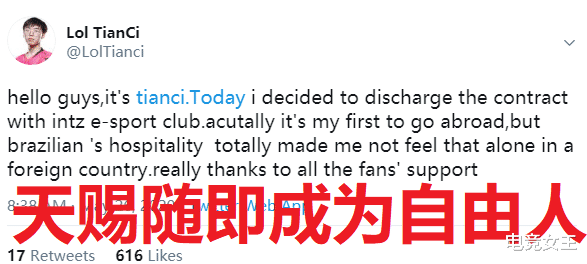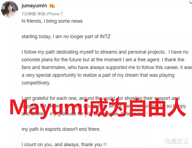 在Mayumi宣布离开之后天赐紧接着发文:我决定从INTZ离开。笔者只看到第一句就笑了,之后写的理由根本不用看八成是在走流程,真正的离开原因也就是跟随Mayumi罢了。天赐这波操作算是给LPL玩家看傻了:这非Mayumi不娶了?不得不说,且不论天赐的比赛成绩,但是对于追Mayumi脚步这件事天赐绝对算得上是世界第一名。