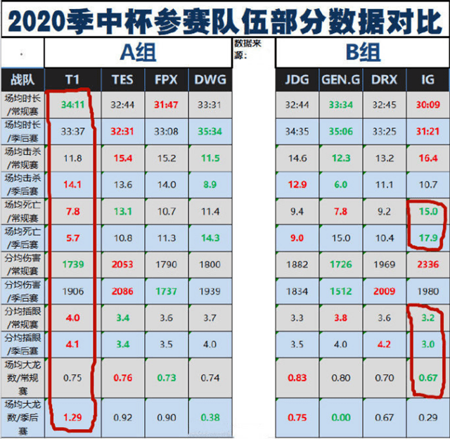 标注红色的数据,说明这支战队在分组中是第一,标注绿色的数据,说明这支战队在分组中是倒数第一。从各项数据来看,skt最强,第一的数据是最多的,总共6项,倒数的仅仅2项。tes战队次之,第一的数据5项,倒数的数据3项。