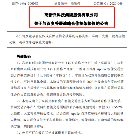 5月27日,高新兴科技集团股份有限公司(股票简称:高新兴,股票代码:300098)发布公告称,公司与北京百度网讯科技有限公司(以下简称:百度)签订《百度 Apollo智能交通生态合作框架协议》,本协议为双方开展战略合作的框架性文件,不涉及具体金额,本协议的签署预计对公司 2020 年及未来年度的经营业绩需视双方后续进一步具体的合作协议和实施情况而定,公司将在签署相关具体合作协议后及时公告。