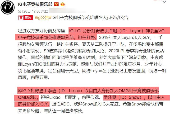 下面就是IG公告,一队首发打野乐言加盟VG,同时担任打野;二队的打野李逍则以自由人身份加盟OMG二队;还一个选手以自由人身份加盟IG二队。没有花里胡哨的操作,IG就完成了本赛季的运作,相信在这三个转会中观众对乐言最感兴趣。