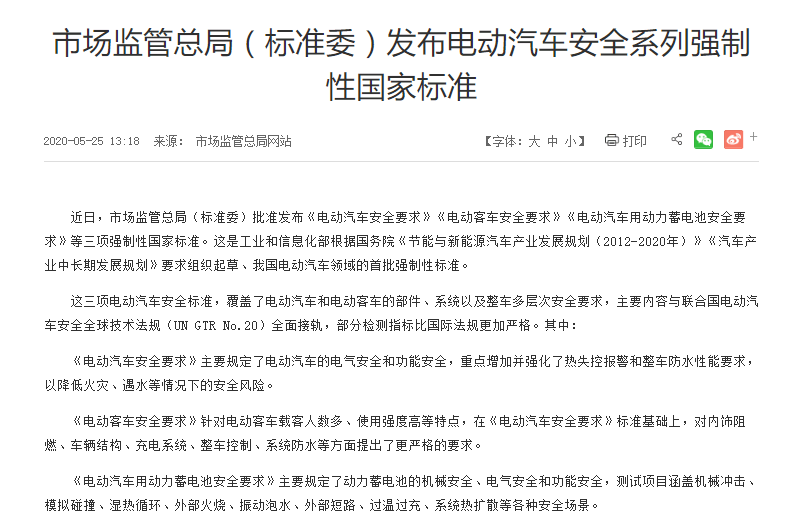 这三项征求意见稿的正式文件,2020年5月25日,正好在国家市场监督管理总局网站进行发布。而在此前一天的5月24日,宁德时代则呼吁新国标《电动汽车用动力蓄电池安全要求》取消针刺测试。