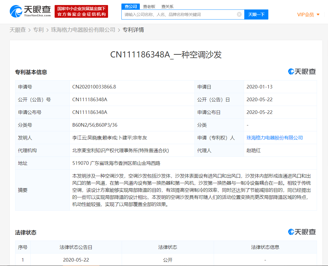 【环球网综合报道】天眼查数据显示,近日,珠海格力电器股份有限公司公开“一种空调沙发”专利,申请日为2020年1月。