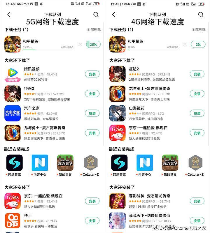最后,我们分别使用5G网络和4G网络在应用商店下载和平精英,打开网速监控,可以看到,5G网络下载的速度约为65MB/S,4G网络则为2MB/S。