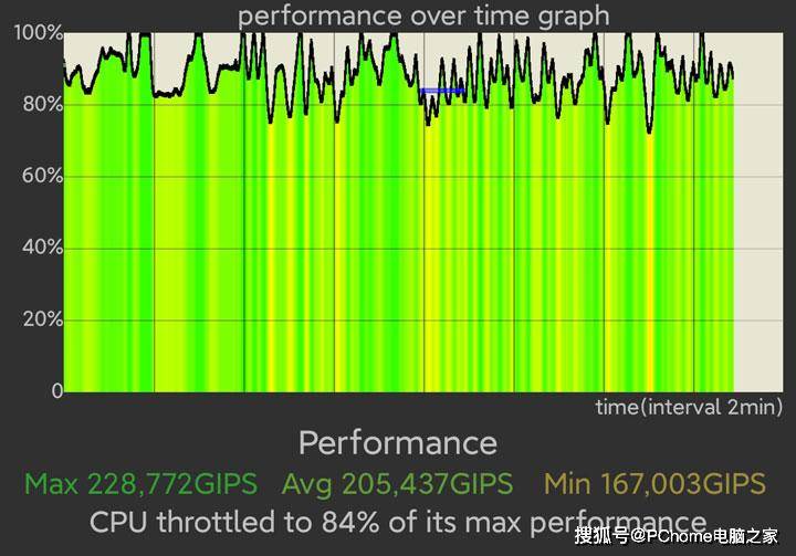 为了测试Redmi 10X Pro的性能稳定性表现,我们使用CPU Throttling Test进行了CPU拷机,看一看Redmi 10X Pro的极限算力表现。在15分钟的测试过程中,天玑820处理器的CPU可以发挥出至少84%的算力,并冲到了最高的2.60GHz主频。