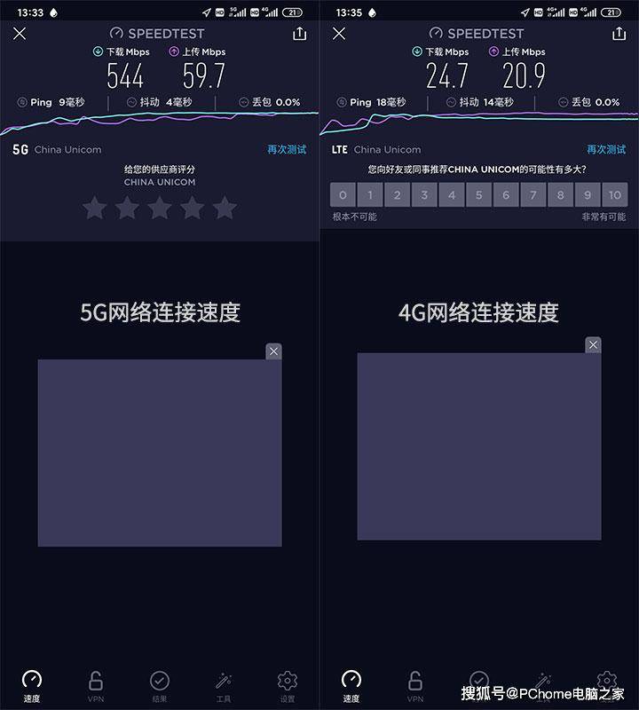 我们选用Speedtest,选用同一连接节点,分别测试5G网络和4G网络条件下Redmi 10X Pro的传输速度。实测Redmi 10X Pro在5G网络下可以达到下行544Mbps,上行59.7Mbps,抖动4ms的水准,在4G网络下可以达到下行24.7Mbps,上行20.9Mbps,抖动14ms的水准,速度差别相当巨大。