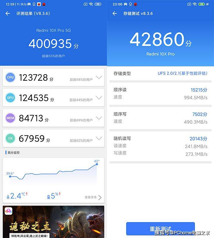下面,我们就实际为Redmi 10X Pro进行跑分。我们使用安兔兔进行综合跑分和存储测试。综合跑分方面,Redmi 10X Pro得分400935分,UX单项得分67959分。存储测试方面,Redmi 10X Pro测出的顺序读写速度分别为994.5MB/s和490.3MB/s,随机读写速度分别为241.8MB/s和273.1MB/s。