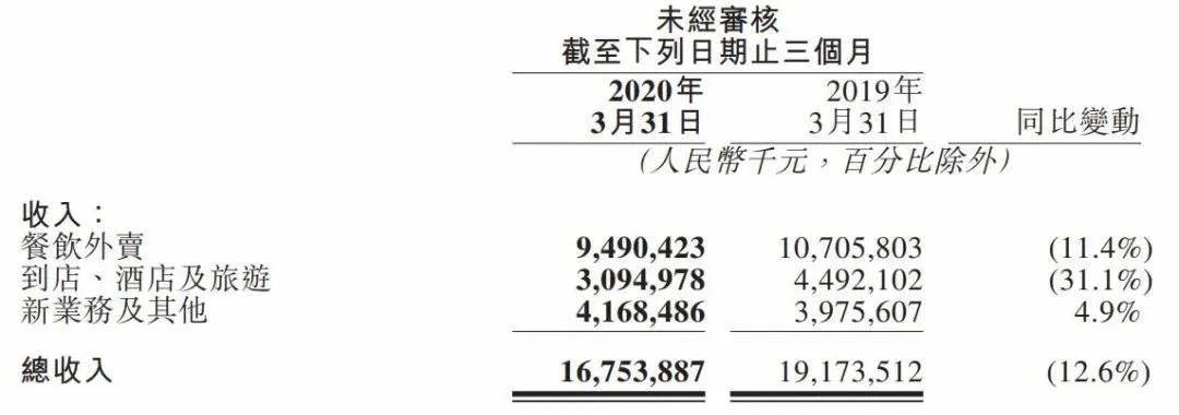 此次财报的数据显示:2020年第一季度,美团点评到店、酒店及旅游业务收入同比下降31.1%至人民币31亿元。
