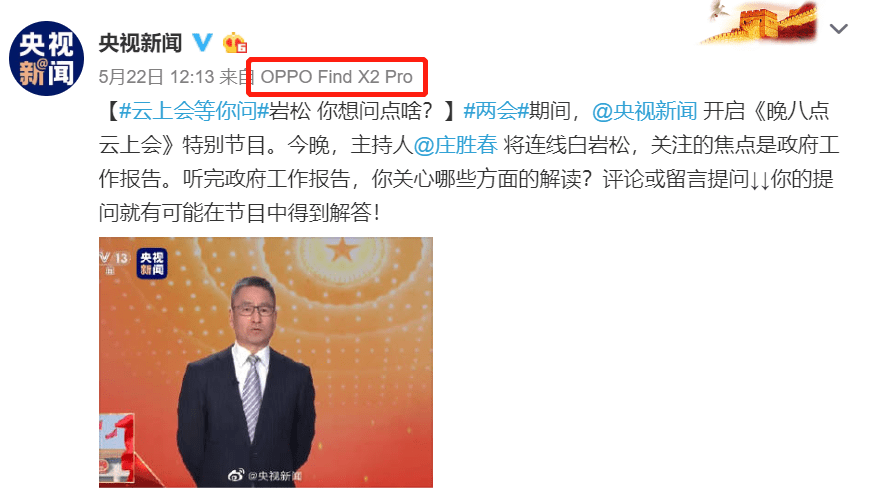 而在5月21日晚,央视新闻在“两会直播”的连线过程中,有人注意到,主持人正在使用国内手机大厂OPPO在今年刚刚推出的新机OPPO Find X2 Pro,全程进行直播连线,并口播:“下面进入OPPO 5G手机连线时间。”而“央视新闻”官方微博,则在报道中,也采用了OPPO Find X2 Pro作为发布设备。