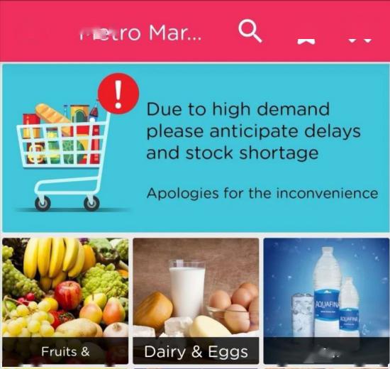 记者住所附近一家超市入驻了外卖软件,由于业务量大,下单时提示可能会缺货或延迟配送。