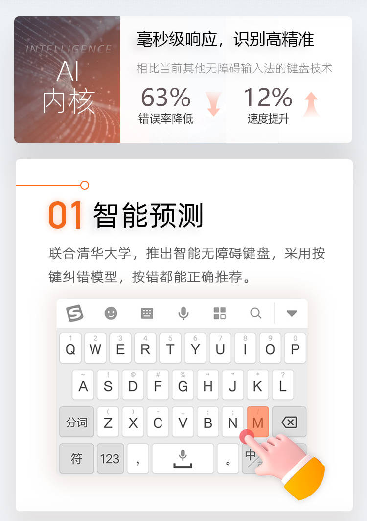 而搜狗输入法此次更新的无障碍模式最大亮点就是上线智能按键预测功能。通过与清华大学人机交互实验室合作,搜狗输入法实现了字符级纠错,基于模型反复测试,有效解决了视障用户打字落点不准确的问题,大幅提升了视障群体的输入效率。根据测评数据显示,相比当前其他无障碍输入法的键盘技术,错误率降低了63%,能够精确识别用户输入的按键,使得输入速度提升12%,实现了毫秒级响应。