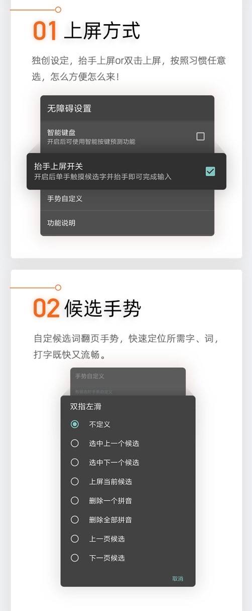 此外,针对用户对于无障碍键盘的不同使用习惯,搜狗输入法还独创了上屏方式和候选手势的自定义功能,视障用户可以根据自己既往的使用习惯和个人偏好,进行自定义设定,不用再费力花时间适应新规则,降低了用户的学习成本,显著提升用户的输入效率。