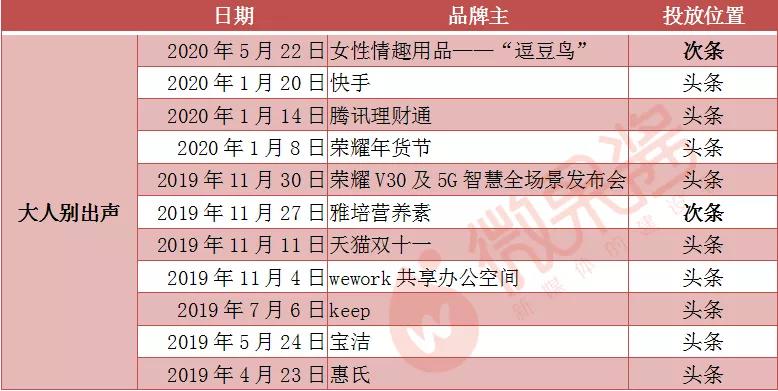 此外,据“大人别出声”对外的刊例价显示,其头条原创条漫广告报价20万元/条(最终的执行价格可能有变),且需要十天筹备期。据微果酱的不完全统计,从2019年4月份到今年5月22日,“大人别出声”一共接了11条广告。