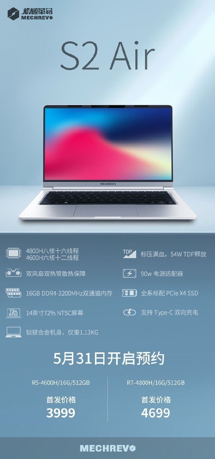 价格方面,机械革命S2 Air笔记本R5版首发3999元,R7版本首发4699元,5月31日预约。