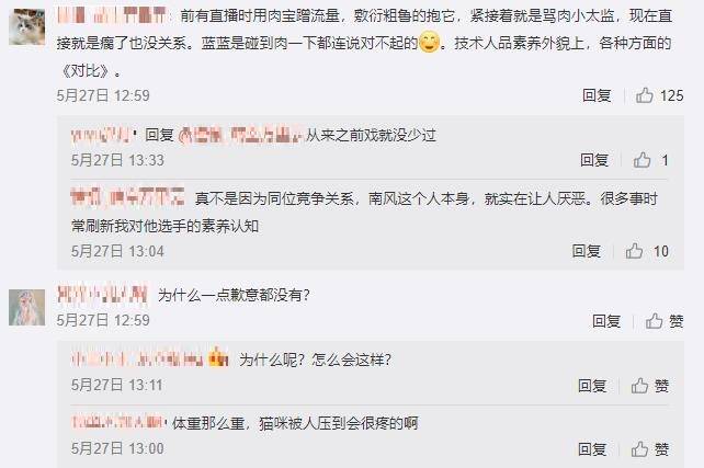 不过虽然证明南风没有骂宝蓝的猫瘸了就瘸了,但是他的确是压到了宝蓝的猫。所以还是有很多宝蓝粉丝怒喷南风:直言他根本就对猫一点感情也没有,压到了别人的猫,不对猫道歉也不对主人道歉,有教养吗?直播的时候抱宝蓝的猫也很粗鲁,从技术人品和外貌上,根本没法跟宝蓝比!