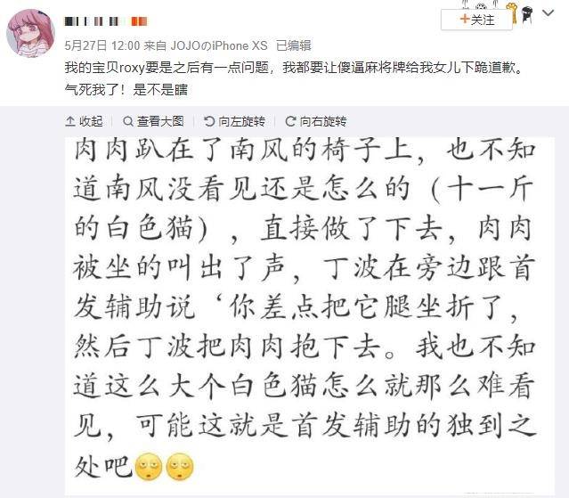 事情是这样的,根据宝蓝粉丝透露,当时是肉肉(也就是宝蓝的猫,叫做Roxy,也不知道为啥又叫肉肉了)在南风的椅子上,南风没有看见直接坐在了椅子上,然后猫叫出了声,后面就是IG副教练丁波责怪南风差点把猫坐瘸了,还有粉丝说南风回了一句:瘸了就瘸了呗!就是这么个事情,宝蓝粉丝认为怎么可能没看见那么大一只猫?就是故意在虐宝蓝的猫。